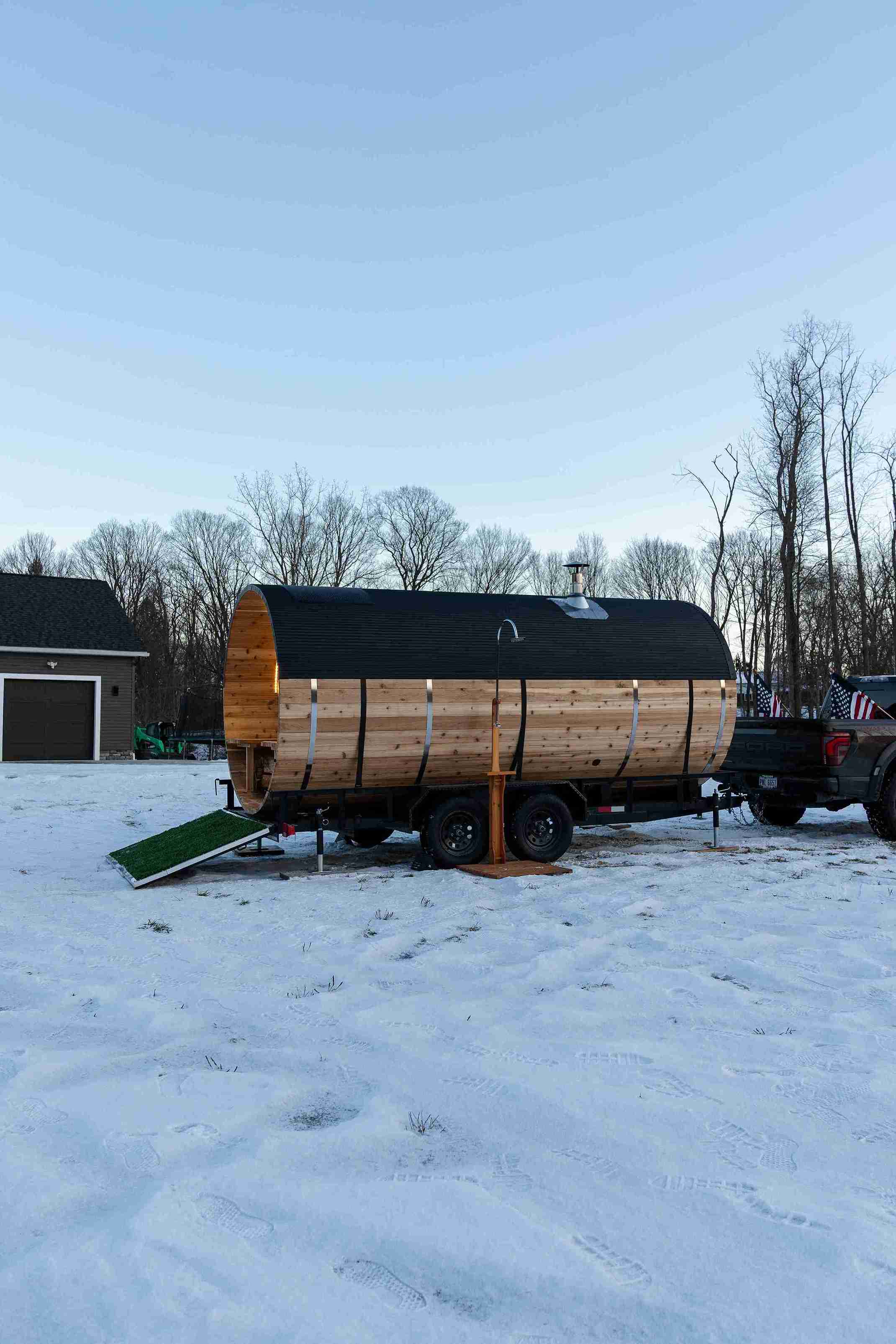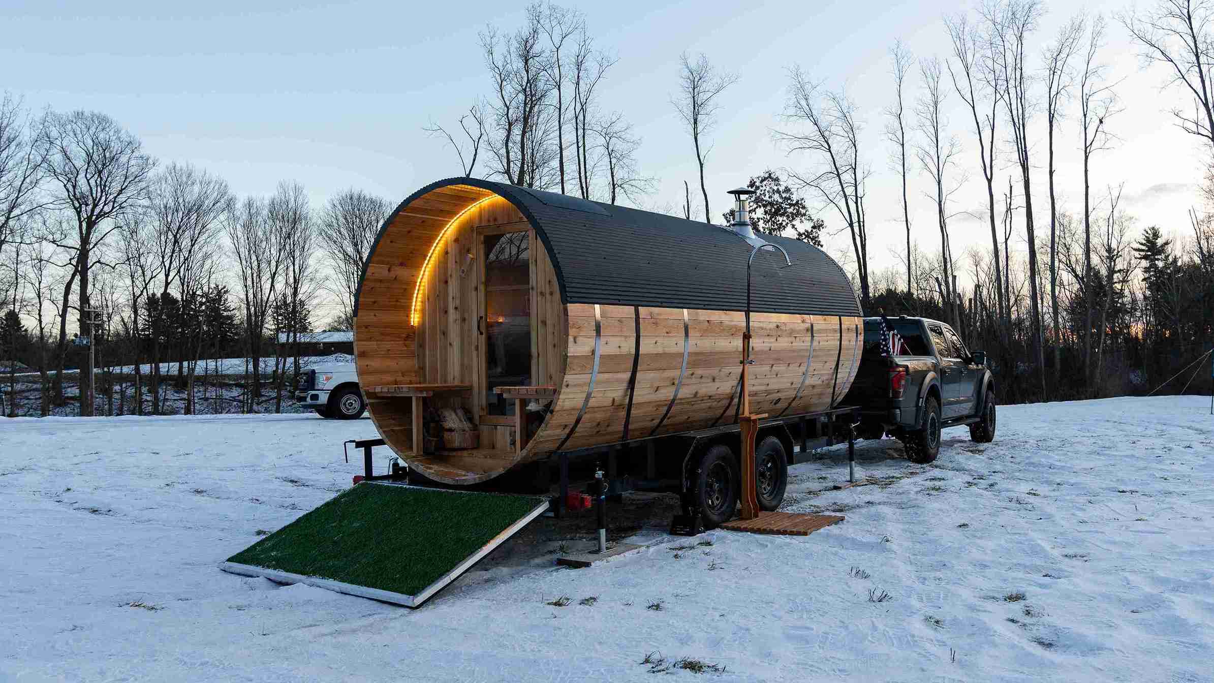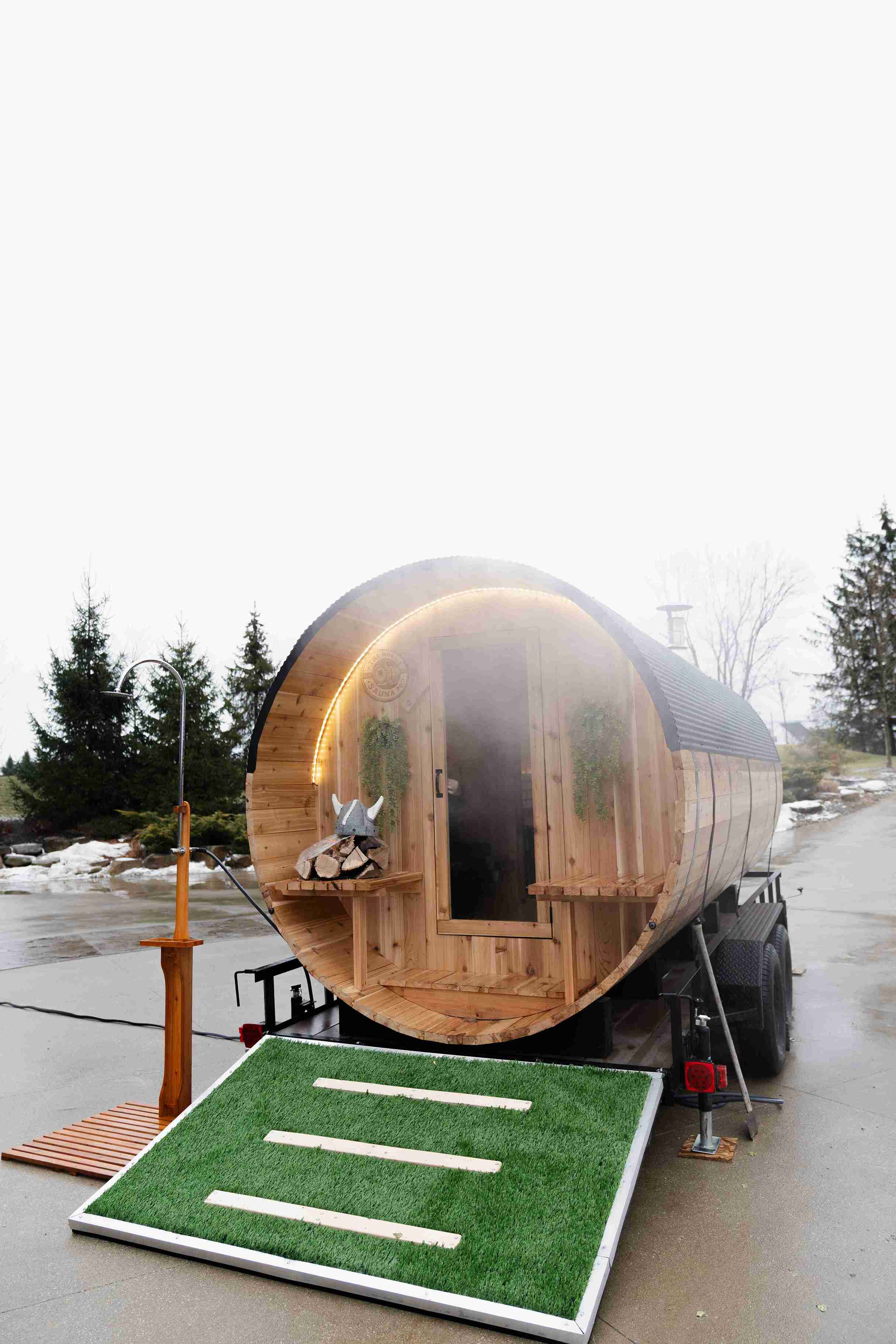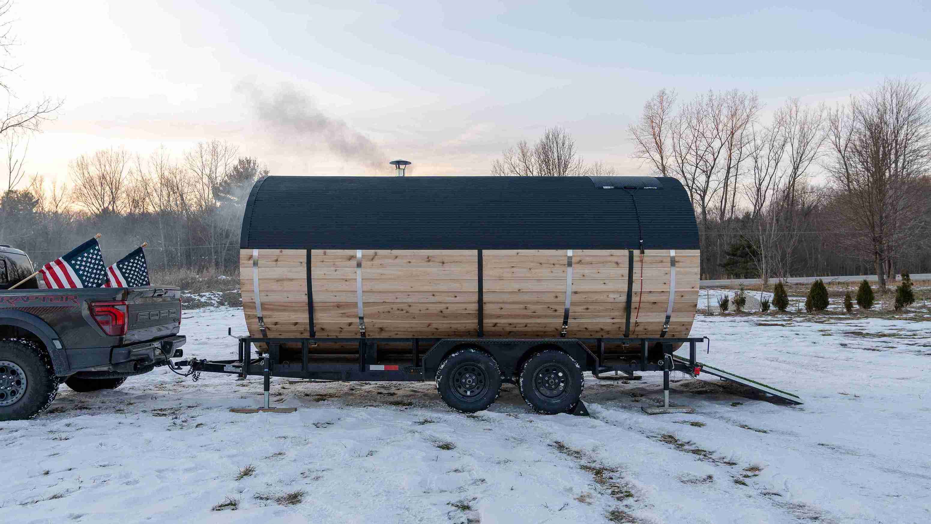 To ensure a smooth delivery and setup, the sauna and trailer require a flat space of approximately 8ft x 20ft with 12ft clearance. The space must be accessible for vehicle delivery.