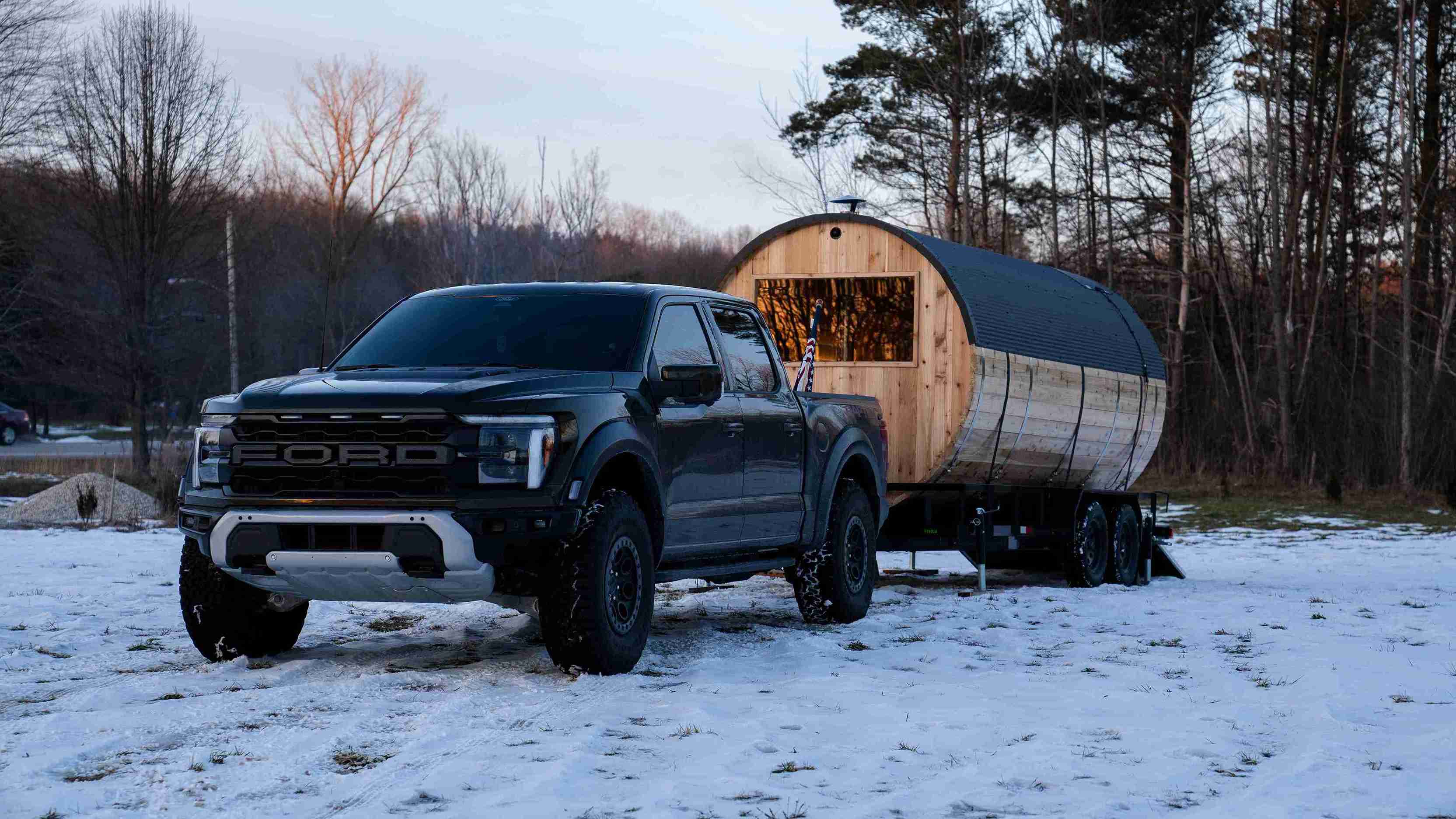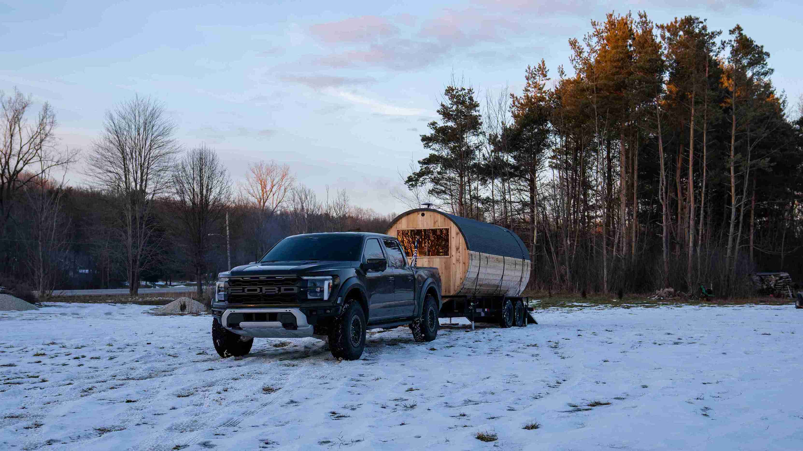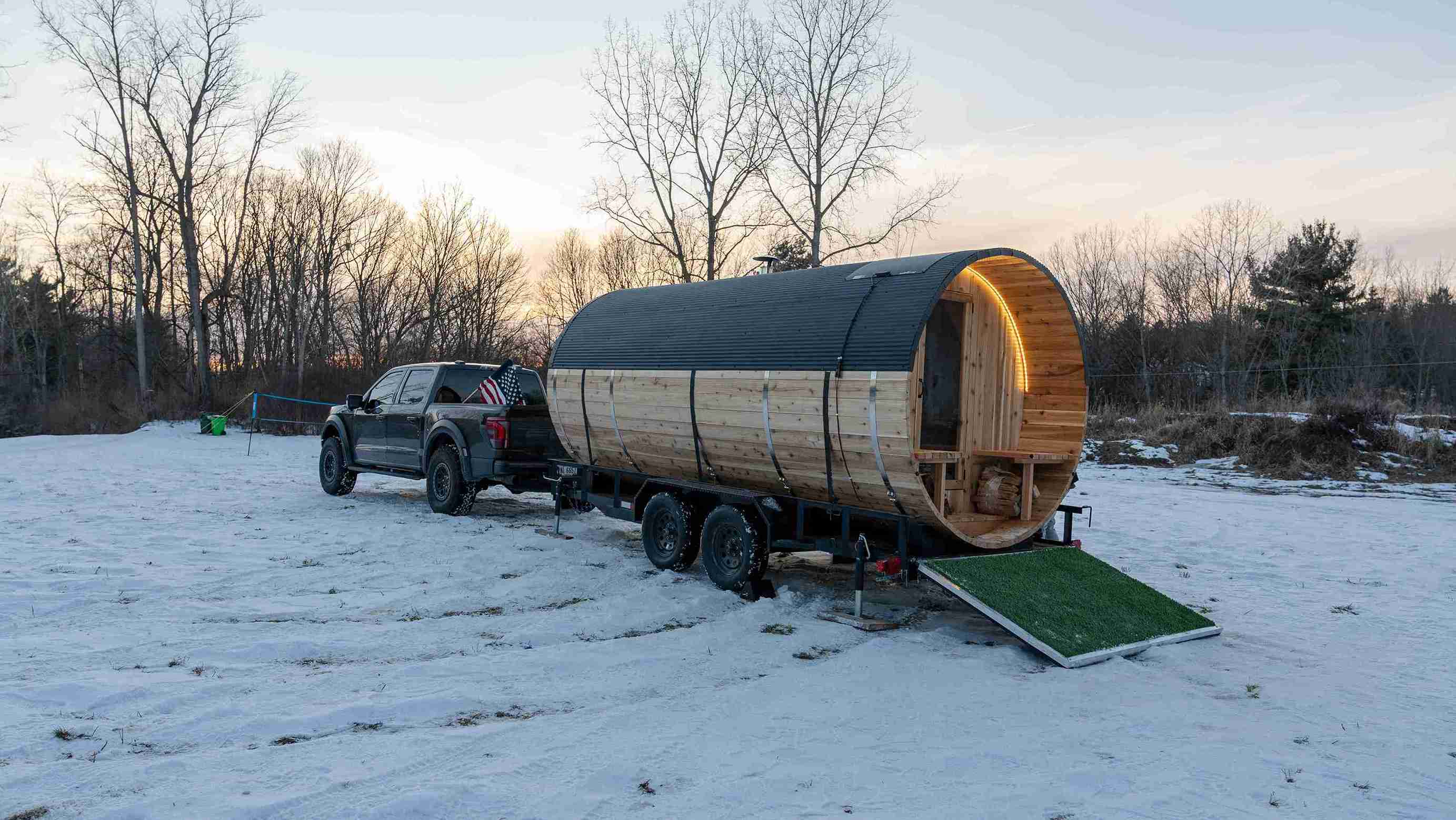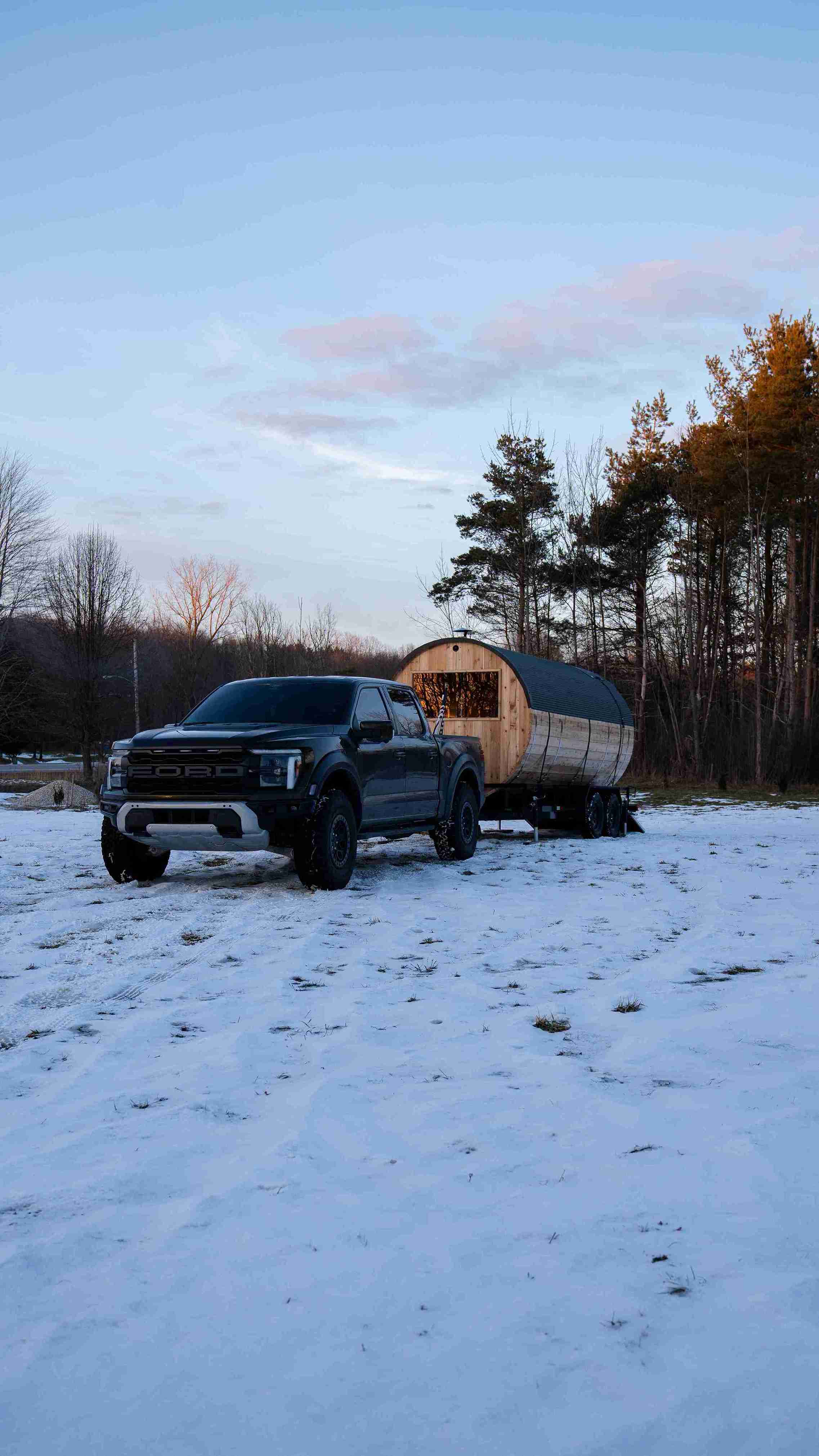To ensure a smooth delivery and setup, the sauna and trailer require a flat space of approximately 8ft x 20ft with 12ft clearance. The space must be accessible for vehicle delivery.